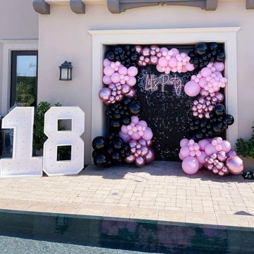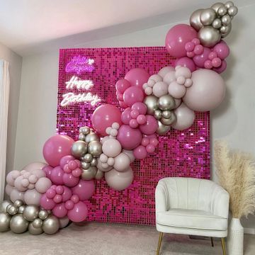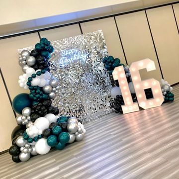 5x6ft Shimmer wall with a balloon garland and up-to 2 marquee light up numbers.