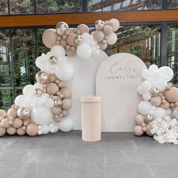 5x6ft Shimmer wall with a balloon garland and up-to 2 marquee light up numbers floral and 3 plinths.