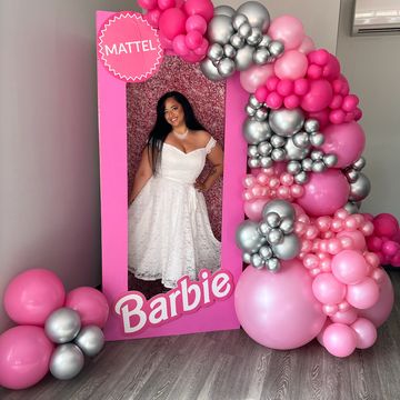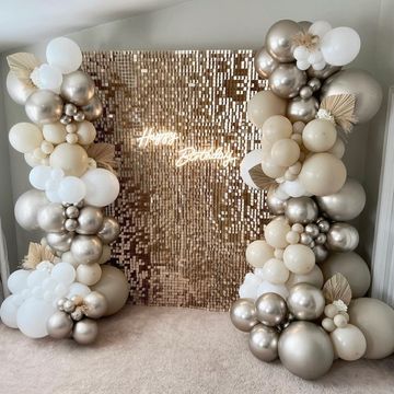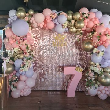 5x6 ft shimmer wall with A 6-7FT balloon garland.