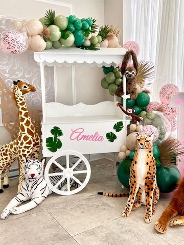 The safari cart packages includes one of our candy cart rentals along with a full sized balloon garland and 3-5 wood or stuffed animals.