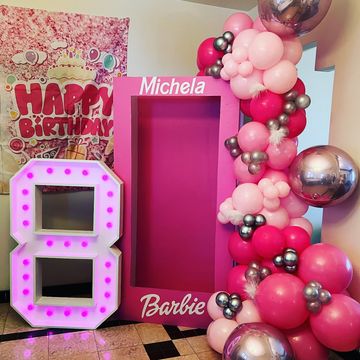 A 6ft panel with a 6ft-7 ft balloon garland with up to 2 light marquee numbers