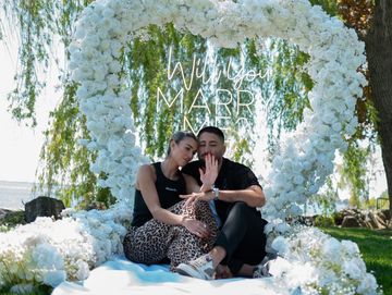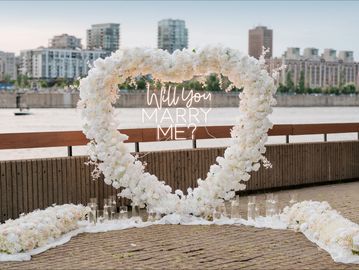 White or red floral heart with neon sign, white or red carpet and 2 white floral runners candles and rose pedals and photographer with drone aerial shots.