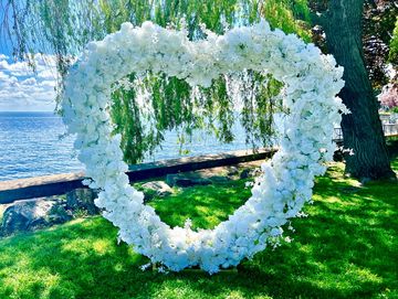 White floral heart with neon sign, white or red carpet and 2 floral runners.